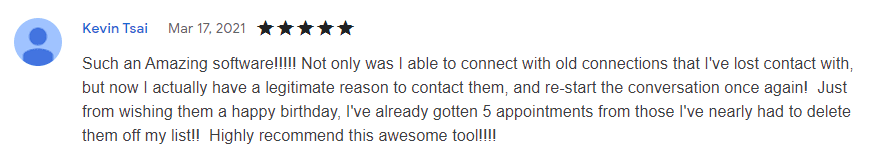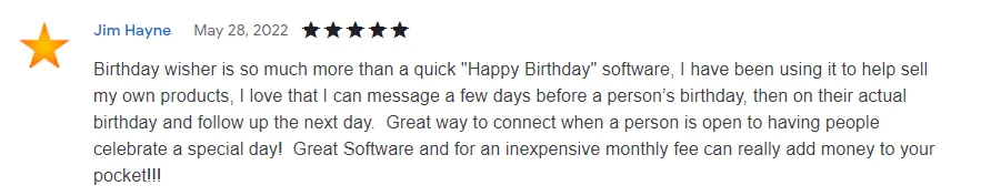 "Easy to use! As marketers, we need to stay top-of-mind with our prospects, leads, and customers. This is the perfect way to do that. Everyone appreciates when we remember their birthday, and we can remind them of what we do and maybe even give them something special to them, we stick on their mind for when they need our product or service down that road. This is a brilliant extension!"